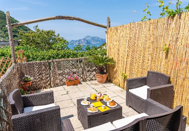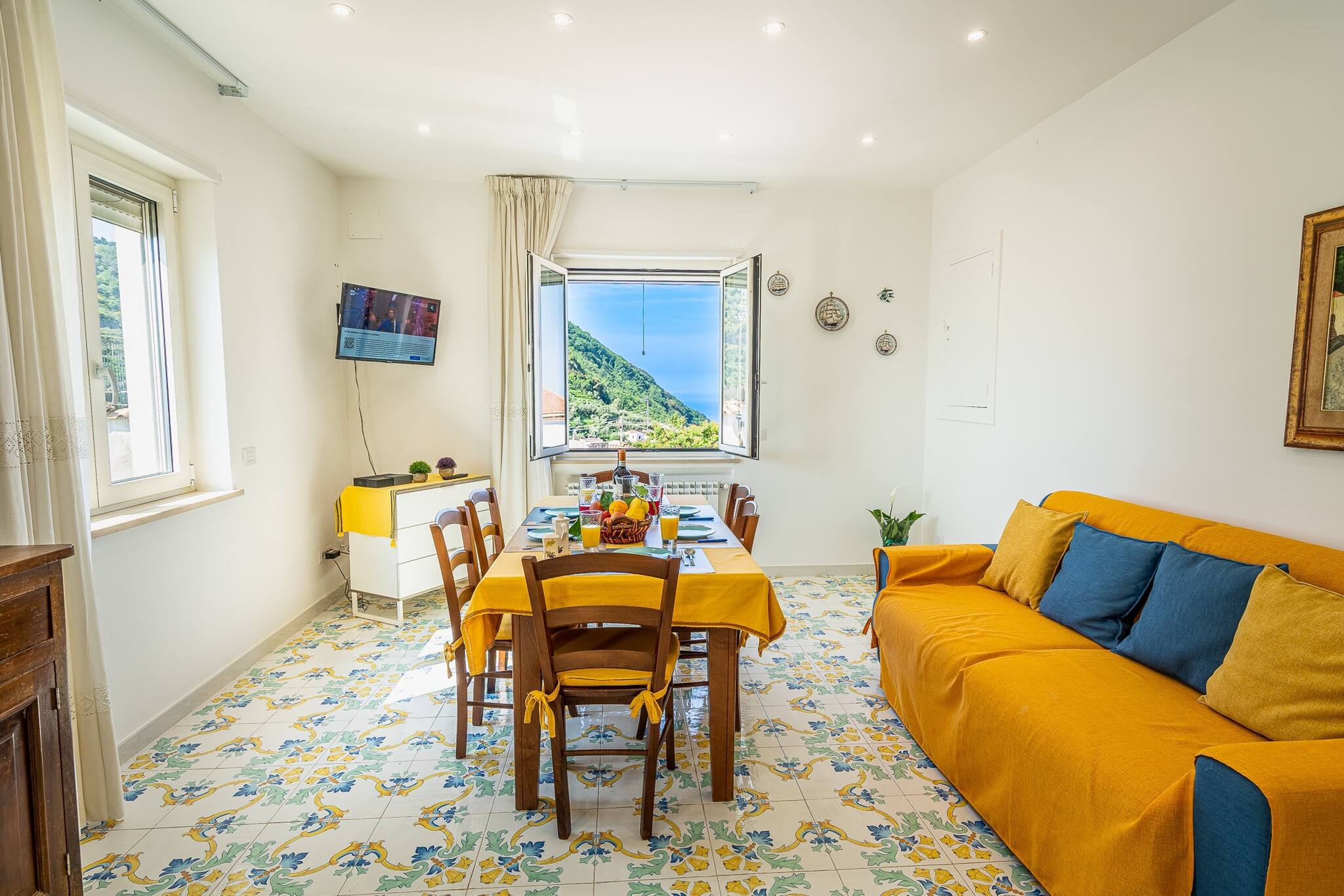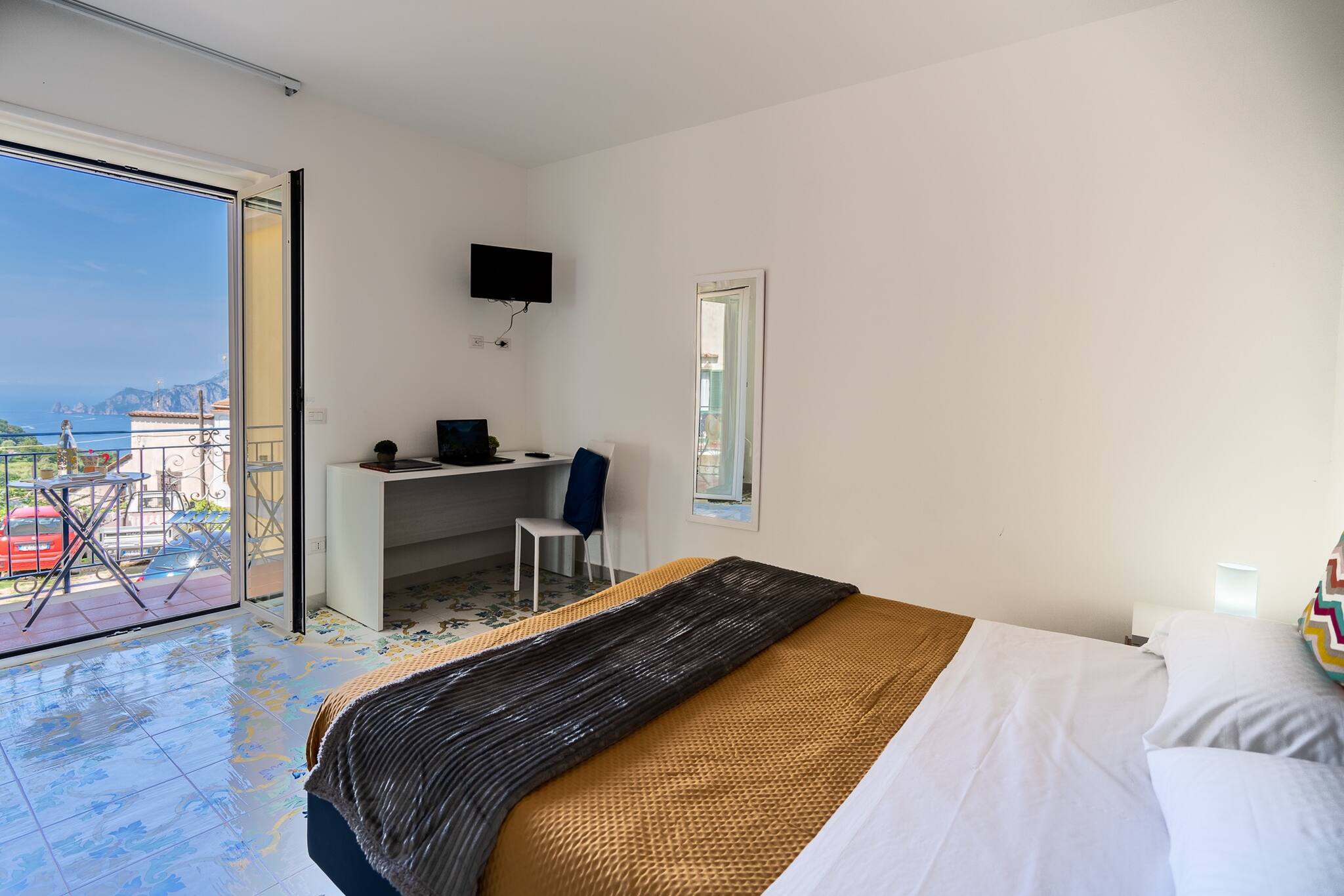 Blue Bell Residence è la scelta perfetta per chi desidera rilassarsi e godersi la bellezza della Costiera. Il patio esterno, attrezzato con comodi divani e un tavolo per pranzi e cene all’aperto, offre un panorama mozzafiato sul mare e sulle isole.
