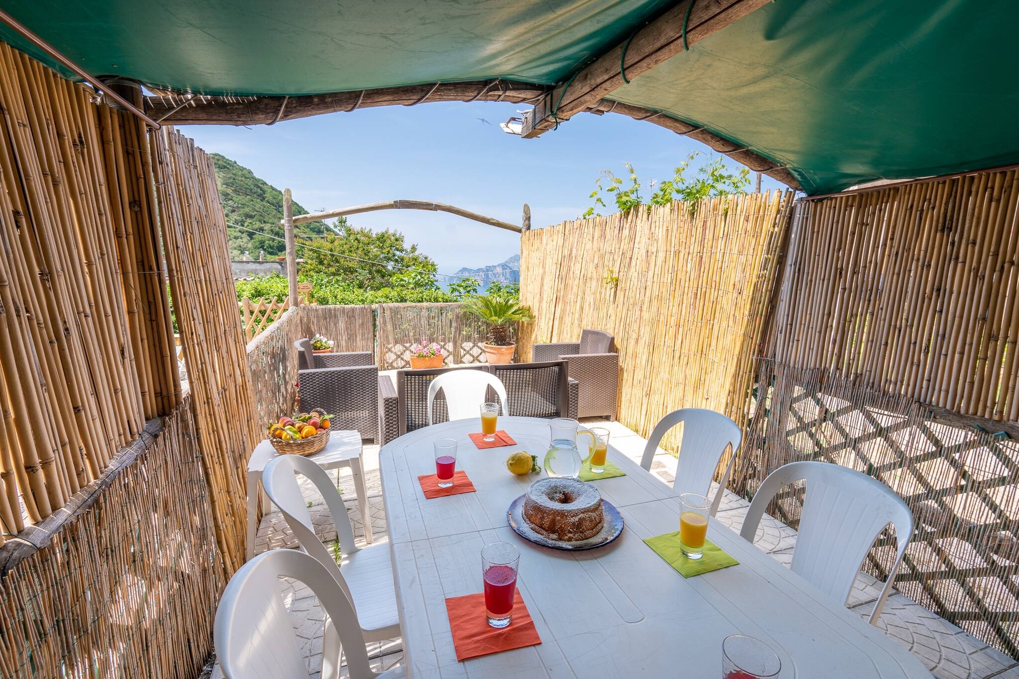 ✔ Patio esterno arredato con divano, poltrone e tavolo da pranzo con vista mare